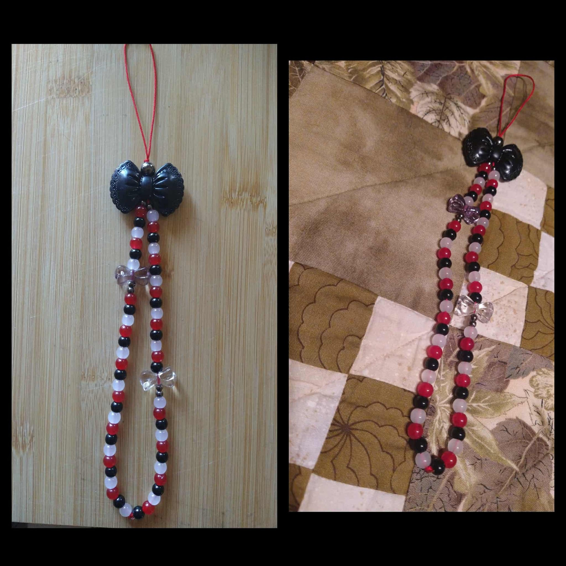 A playful dose of charm, elevate your phone's aesthetic with a charm that's equal parts bold, cute, and irresistibly eye-catching. This handcrafted accessory features a striking oversized black acrylic bow as its centerpiece - designed to stand out and make your device uniquely yours. Complimenting it are clusters of red, black, and white glossy acrylic beads that add the perfect pop of color and shine. To complete the look, this charm features one sleek black bow and one crystal clear white bow creating a perfect blend of contrast and cohesion.